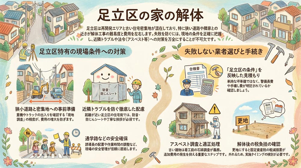 はじめに 板橋区で家の解体を考えるときは、「建物を壊す」だけでなく、周辺環境・道路条件・近隣配慮・法令手続きまで含めて段取りすることが大切です。 特に板橋区は住宅地が広く、エリアによって道路幅や建物の密集度が大きく変わる […]
